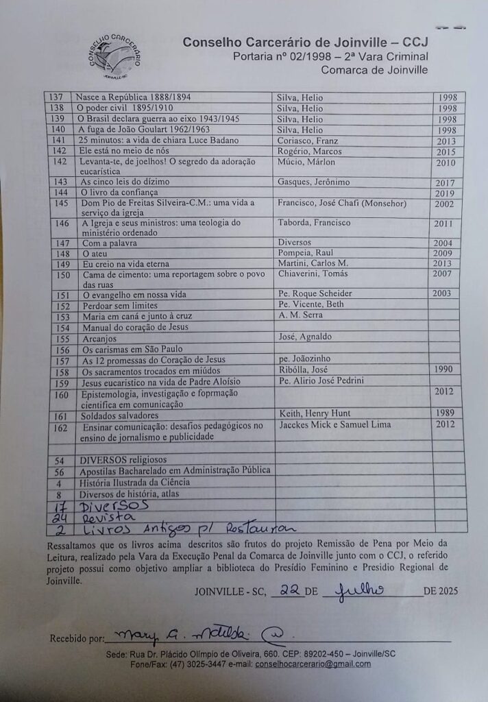 O CCJ realiza mais uma entrega de livros para a biblioteca do Presídio Feminino de Joinville (PFJ). Foram catalogados 162 livros de literatura em geral somados a mais 165 diversos entre religiosos, apostila, revistas e bíblias.